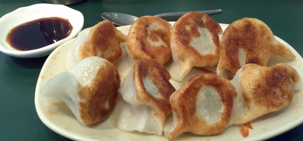 Jen’s Cafe is a small triangular cafe at the south end of Newport Place and sells noodle soup, dumplings and boba tea. It is a tiny spot with maybe six tables and a small counter that seats four people. Here we got an order of Beijing dumplings, which were a boiled pork and chive dumpling, and an order of fried dumplings, which were essentially pan fried versions of the Beijing dumplings. Both dumplings tasted quite good with a solid savory pork flavor, although the Beijing dumplings were not quite as good as the ones at Leoung’s Legends Continue. The fried dumplings were nicely crisped on the bottom without being oily. The counter and tables were stocked with bottles of soy, white and black vinegar, and hot oil so you can build your own dipping sauces.