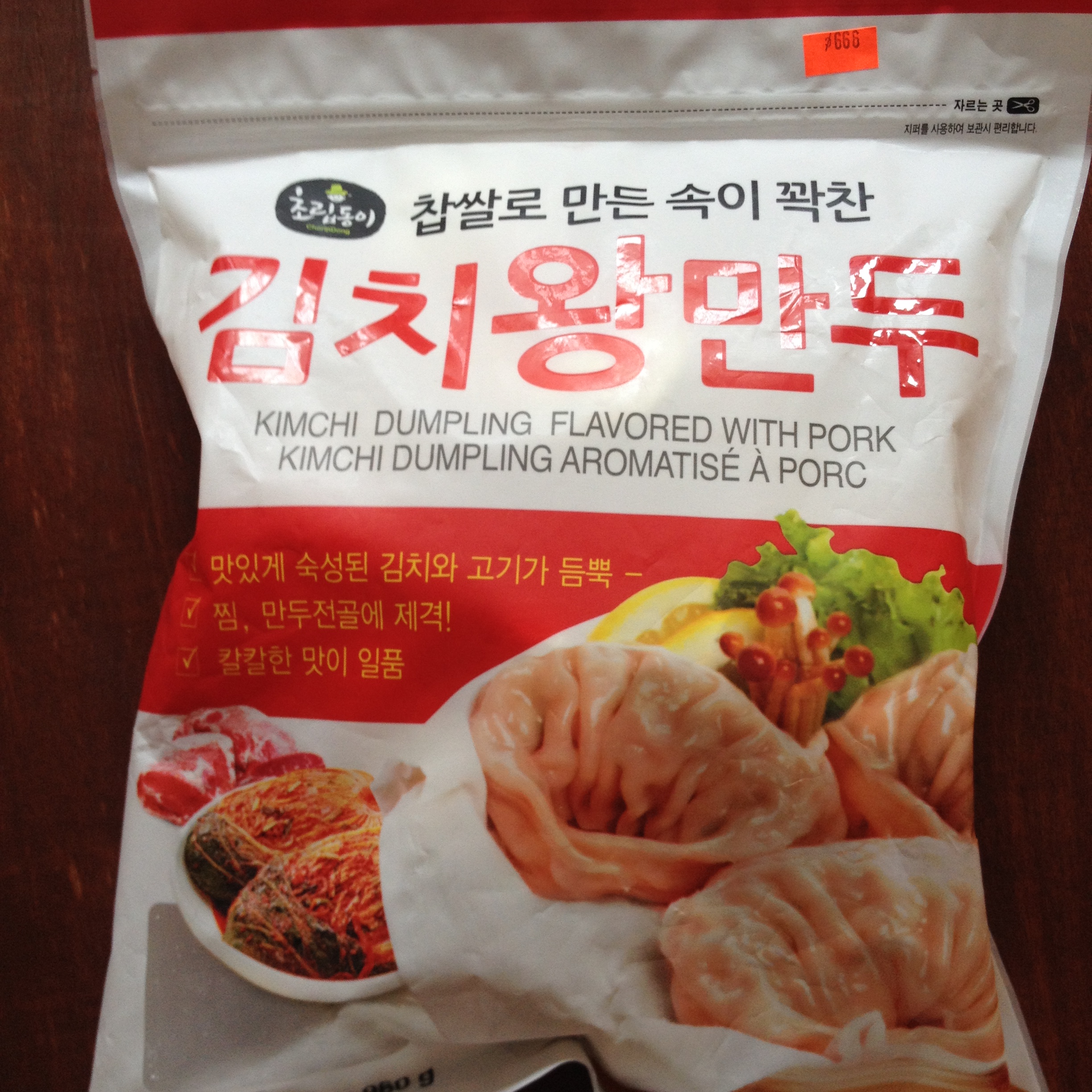 The ChoripDong Kimchi dumplings flavored with pork are excellent. Either pan fried or steamed the dumplings came out with a really juicy, flavorful filling. The cabbage kimchi filling has a medium spicy heat and satisfying crunch, while the pork flavor still comes through the kimchi heat. These dumplings are really large and if you take them right out of the freezer bag they take a long time to steam or pan fry. I recommend giving them a quick micro-wave blast to defrost them before you steam or pan-fry them.