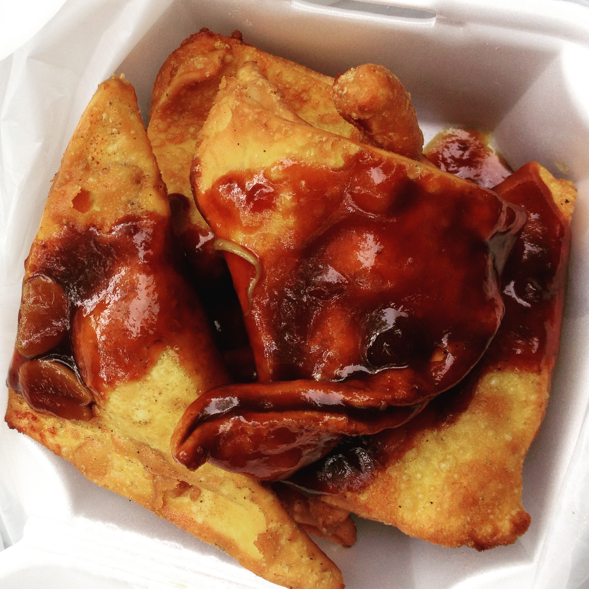 The Dipping Sauce: The dumplings are served doused in a ladle full of thick brown sauce/gravy that has a sweet ginger flavor. The sauce has slivered scallions in it and slices of ginger. I thought the sauce was quite good and in a way made up for the modest amount of filling in the dumpling, the excess fried wonton around the filling served as a chip like implement to eat the sauce with.