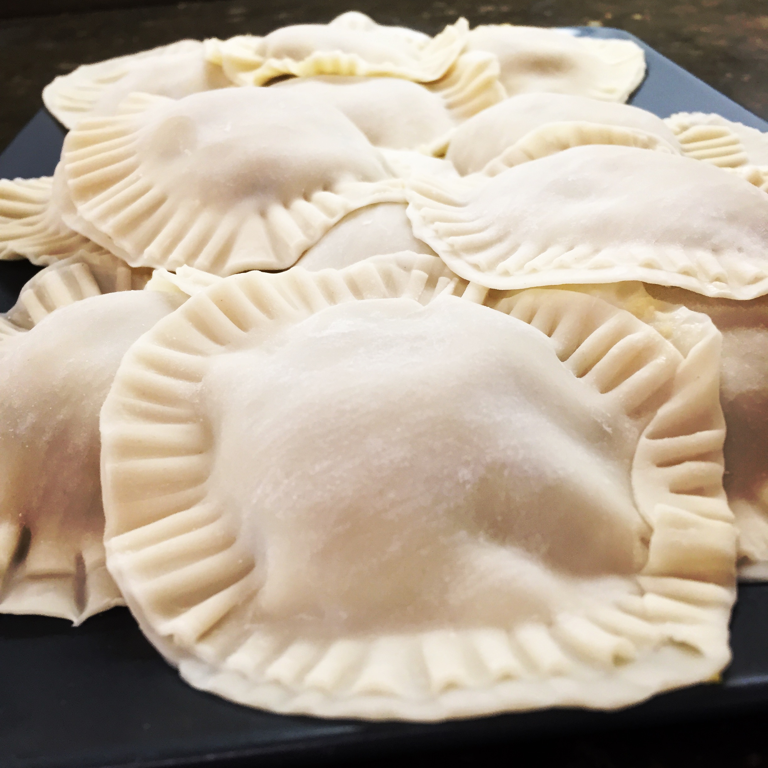 This is a pretty quick potato pierogi recipe that uses pre-made round Chinese dumpling wrappers.