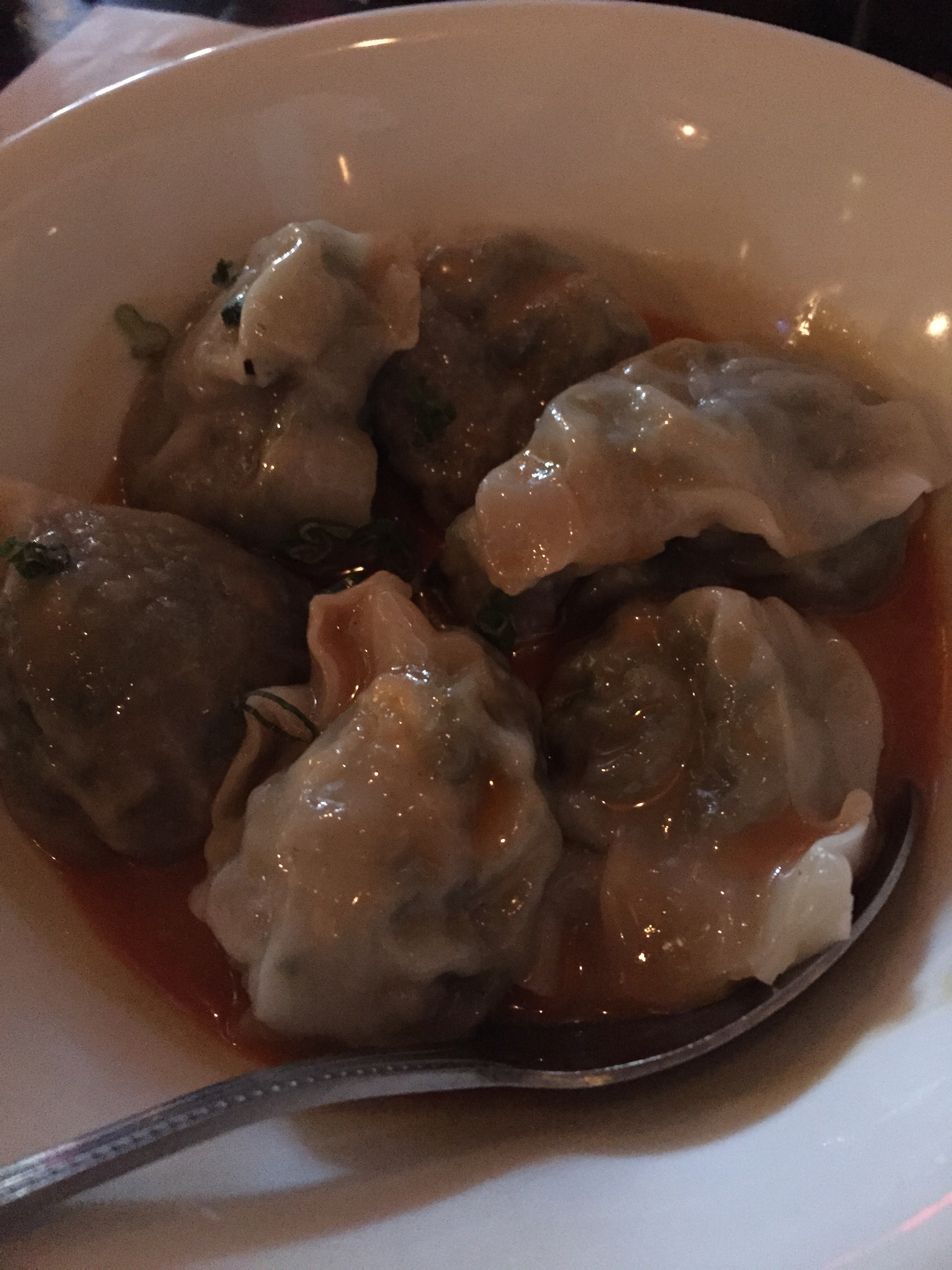 About a year ago I went to see a show in Williamsburg Brooklyn and stumbled upon M Shanghai Bistro and Garden. Last time around I was pretty impressed with both the quality of the dumplings they were turning out and with the depth of their dumpling menu. I recently caught another show in Williamsburg and returned to M Shanghai to try some more dumplings. This time around I tried the Spicy Wontons which come as either pork or vegetable (vegan) wontons – I went with the vegetable wontons. It is a little dark in M Shanghai but I think the filling was comporised of spinach and mushrooms. The wontons were really good but the spicy sauce was disappointing. Instead of a hot chili oil sauce, it was similar to the sauce you get on cold sesame noodles, probably a mix of sesame oil (or maybe tahini) and peanut butter, and had only the barest hint of spice.