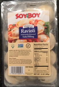 I just discovered that Soy Boy also makes frozen vegan tofu ravioli, they sell Original Ravioli (filled with seasoned tofu), Rosa Ravioli (tomato flavored pasta filled with tofu and roasted red pepper) and Verde Ravioli (spinach flavored pasta filled with garden herb-seasoned tofu). The Original Ravioli are round and silver dollar sized and the tofu filling is seasoned with lemon juice, onions, garlic powder and herbs and spices. The ravioli filling had a convincing ricotta cheese texture but I thought it was quite bland, maybe they have gone too far in the low sodium direction. I think their filling could also have used some nutritional yeast to add some cheese and umami flavor. Soy Boy’s ravioli are a convenient vegan dish, but I prefer the flavor profile of our vegan ravioli recipe.
