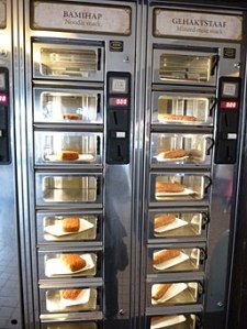 Automats were fast food restaurants, popular in the U.S. in the mid-1900’s, where simple foods and drink were served by vending machines. The world’s first Automat opened in Berlin, Germany in 1895 and they were brought to the U.S. in 1902 by the restaurant chain Horn and Hardart, which opened its first Automat in Philadelphia. Automats started to decline in popularity in the 1960s, and the last ones in New York City closed in 1991. I remember seeing the last of the Automats in NYC shortly after I moved there. On a recent trip to Paris I found a vending machine built into the wall of a corner butcher shop that sold ham products, kind of a pork Automat.