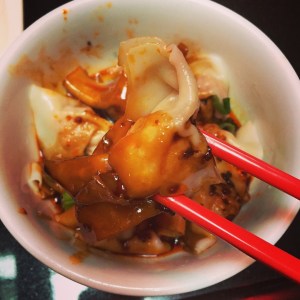 The Dumplings: Han Dynasty’s menu includes Dumplings in Chili Oil, Wontons in Chili Oil, Chicken Dumplings and Vegetable Dumplings. The Han Dynasty menu provides spiciness gradings for the dishes from 1 to 10, the Dumplings in Chili Oil are rated a 4 and the Wontons in Chili Oil are rated a 6. Other than the difference in spice level, the waiter described the difference in the wontons and dumplings as the wrappers of the dumplings are 4 times thicker than the wrappers of the wontons, he was very precise about this. The Wontons in Chili Oil looked really good but other than a striking, almost painful level of spice heat, these pork wontons and their sauce had no flavor. My dining companion asked that the heat on the level 4 Dumplings with Chili Oil be dialed back a bit, which revealed a bitter burnt flavor in the sauce. Maybe the toasting of the sesame oil went too far.