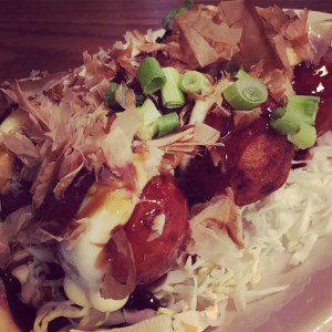 The Dumplings: The Takoyaki at Ku are expertly cooked so they are crispy and crunchy on the outside with a creamy interior and a small piece of just cooked crunchy octopus in the middle. They are served blazing hot, so let them cool a little or risk burning your mouth. The Takoyaki are served on a bed of slivered cabbage and are adorned with drizzles of brown Tako sauce and Japanese mayo, sheets of bonito flakes and chopped scallions. The best Takoyaki have layers of toppings that bring a symphony of sweet, tangy sour, umami, and salty flavors to the dumplings. But at Ku the scallion pieces were cut too big for my taste and their strong flavor over powered the other toppings. I think they should have been cut finer and used a little more sparingly. But if you pick off some of the chunks of scallion these Takoyaki were really good. Ku also serves pan-fried gyoza.