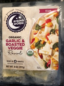 I gave their White Bean and Kale Ravioli and Spinach Florentine Ravioli 5 star ratings, but felt their Mushroom Ravioli fell short and only gave them 2.5 stars. This time I tried Rising Moon’s Organic Garlic & Roasted Veggie Ravioli which are part of their vegan line and are filled with tofu, butternut squash, spinach, garlic, carrots, tomato and onion powder. With their distinct roast garlic flavor that can complement a strong marinara sauce, these ravioli rate 5 stars. The other components of the filling don’t really provide much flavor but presumably add some nutrient value. I boiled the ravioli as instructed on the package and served them with a homemade spicy red sauce that worked with really well with the ravioli’s roasted garlic flavor. These ravioli make an excellent quick dinner for two.