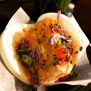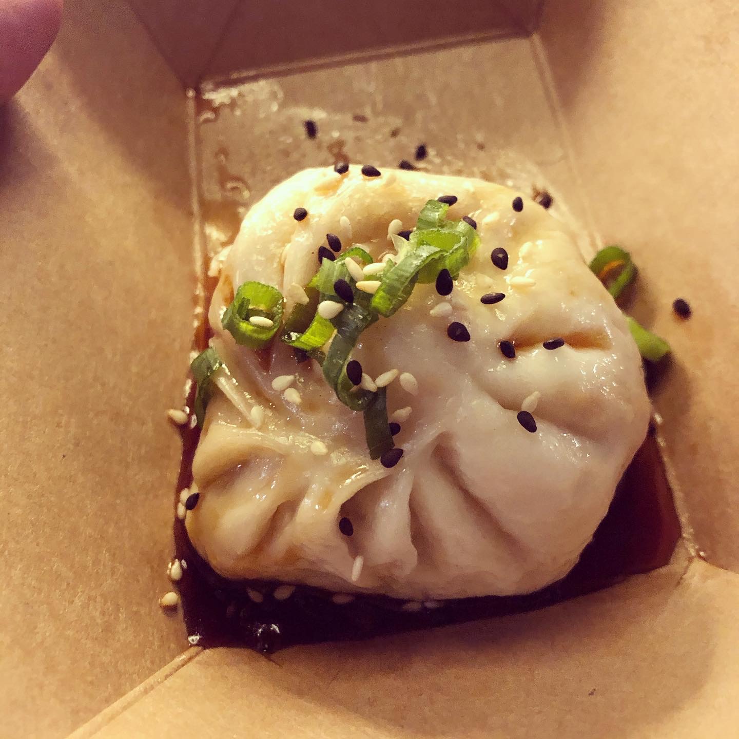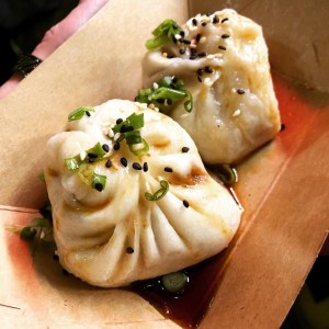 The last of the dumpling options is Destination Dumplings, which was by far the best of the five places I tried. Chef Tristan Chin-Fatt and Deon Whiskey, the two owners, describe themselves as two kids from Queens, and were both born in Flushing, the Asian food mecca of Queens. Destination Dumplings doesn’t have a permanent location yet and instead does pop-ups and catered events. I got to Bryant Park at around 7 and it looked like Destination Dumplings had been slammed with customers, they were out of almost everything. Dishes I wasn’t able to try include – dumplings stuffed with Pork and Chive, Korean Beef, Peking Duck, or Edamame and steamed Bao filled with Spicy Pork. They did have regular pork bao, which were a revelation and the best dumpling that I tried at Bryant Park. The pork filling was incredibly well seasoned, flavorful and juicy, like eating pork that had been slow braised in a soy based marinade for hours. I ordered two bao and then went back for a third one. The bao were served with slivered scallion and sesame seeds and were doused with soy sauce.
