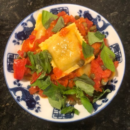 Kite Hill mushroom and ricotta ravioli with with sautéed tomatoes, garlic and capers in white wine, dressed with torn basil leaves