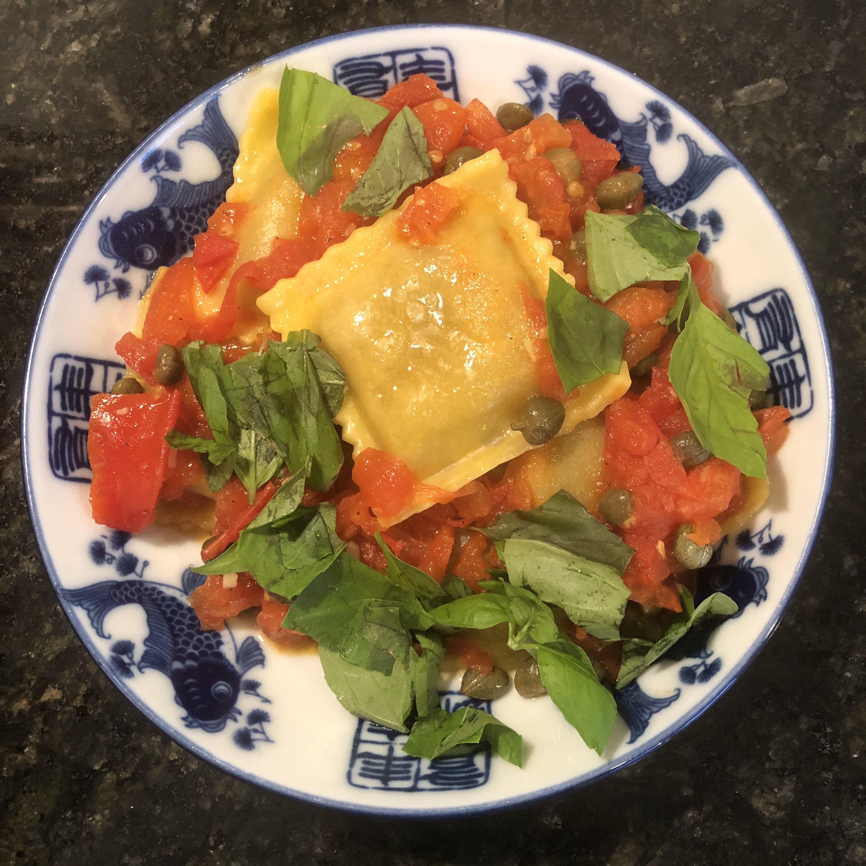 Kite Hill mushroom and ricotta ravioli with with sautéed tomatoes, garlic and capers in white wine, dressed with torn basil leaves