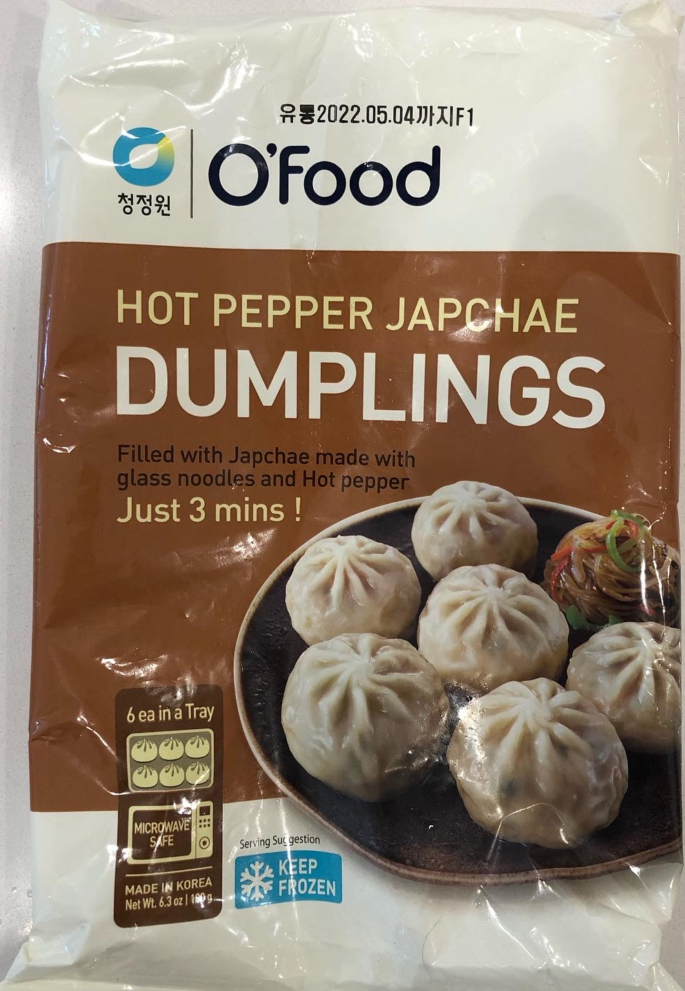I hit Philadelphia’s H-Mart for the first time to stock up on groceries and was blown away by the expansiveness of this H-Mart. It has the largest wall of freezer cabinets dedicated to dumplings I have ever seen, with the bags and boxes organized by country. For some reason the O’Foods Hot Pepper Japchae Dumplings caught my eye. O’Food is the global brand representing Korea’s Chung Jung One food brand, which was founded on 1956 in Sunchang province as a fermenter making Gochujang and Doenjang paste.
