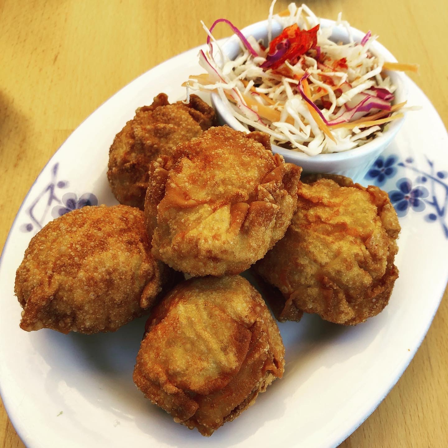 The Dumplings: Ratchada serves three types of dumplings: Thai dumplings filled with ground pork, water chestnuts and Thai herbs; the Tulip dumpling filled with steamed ground shrimp, chicken and crabmeat; and the vegan Buddha dumpling. The Thai dumpling is a golf ball sized ball of pork and chopped water chestnut that is wrapped in a wonton, with the wonton smoothed around the meat so the dumpling is spherical. These dumplings are deep fried until the wonton has formed a crispy shell around pork, which stays very juicy and fragrant with Thai herbs. Be careful when biting into these dumplings, they stay really hot inside and also when you crunch through the shell, juice may shoot out. This was a very, very good dumpling. It came with a thick soy based dipping sauce and a cabbage slaw. The waitress told us that a lot of people don’t eat the slaw, apparently thinking it is decoration, but you must eat the slaw, it is delicious: sweet, sour, spicy and crunchy.