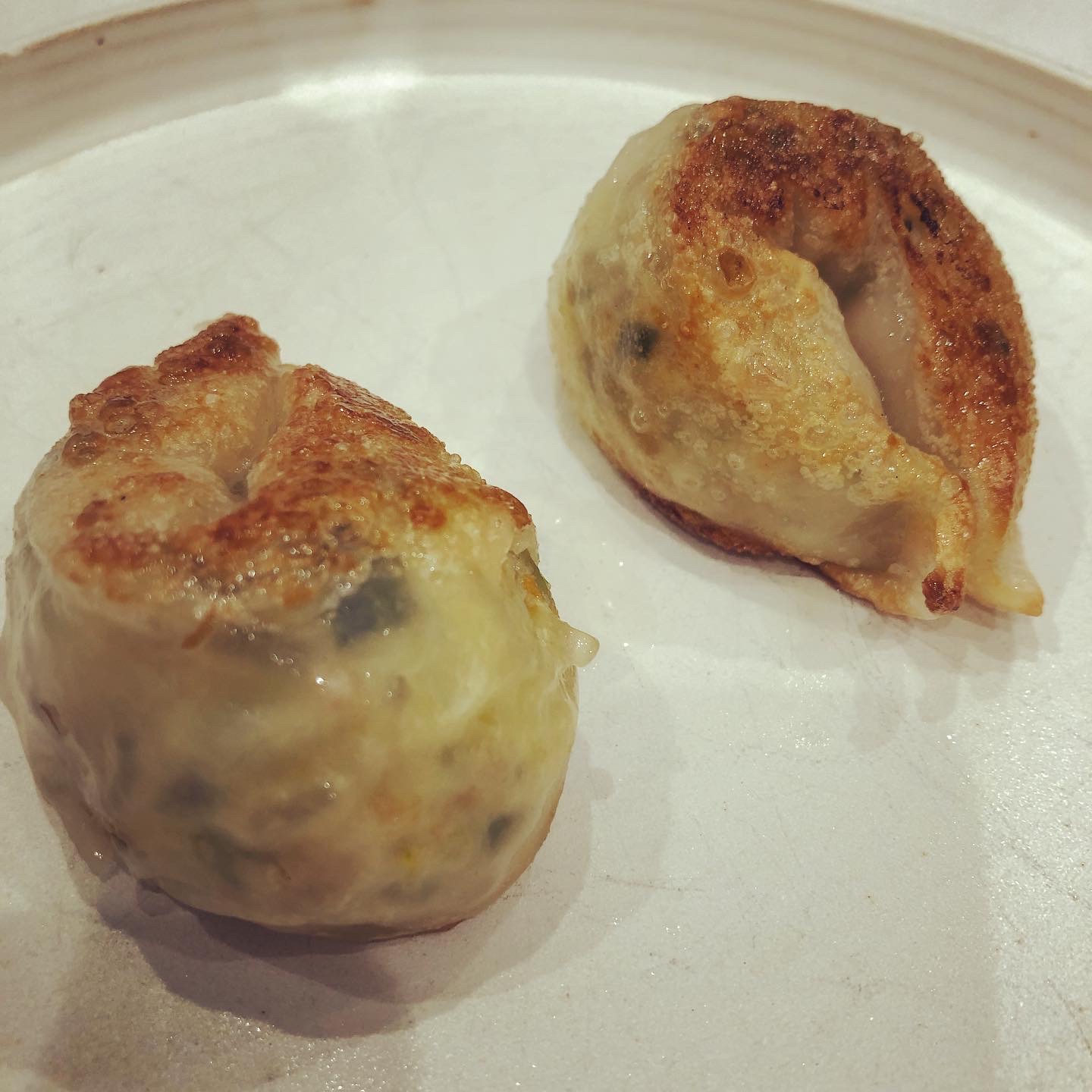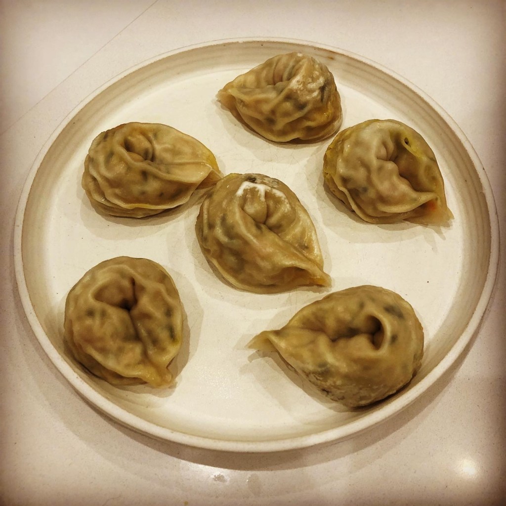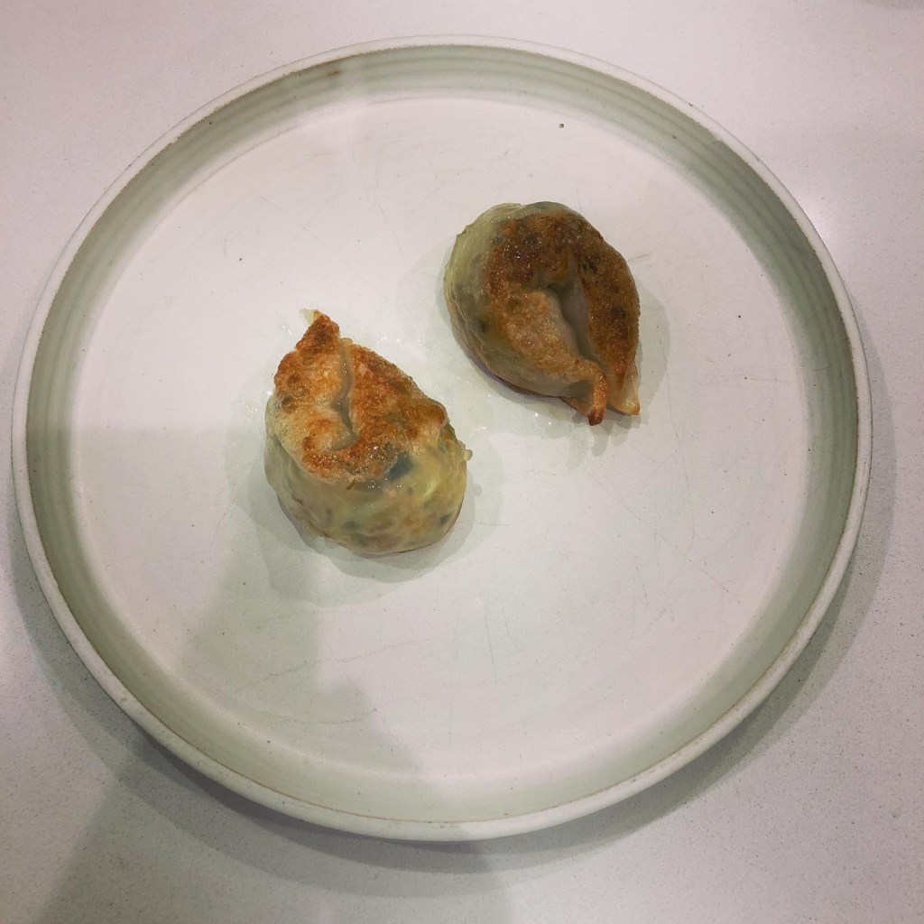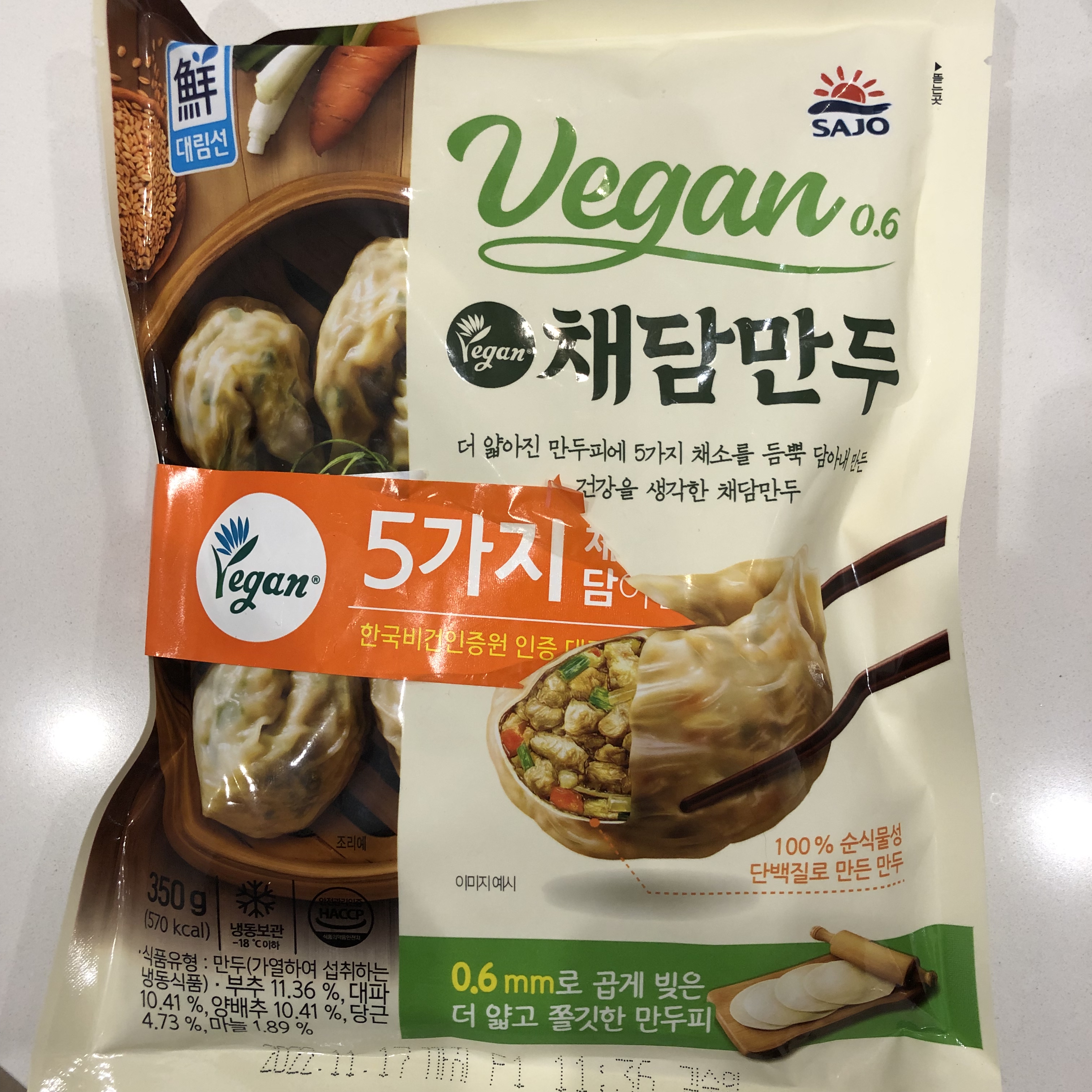 I could not find out a lot about this Korean company online, although several online retailers sell these dumplings. The search was also difficult because several Korean companies have Sajo in their name. These dumpling’s claim to fame is that their wrappers are supper thin, 0.6 mm thin, as proudly displayed in the name on the packaging. The dumplings are filled with tofu, green onions, cabbage, carrots and glass noodles and something called artificial beef flavour 04076. The dumplings tasted quite good, with general savory flavor, with some cabbage notes at the end. I did not notice any of the fake beef flavor. The dumpling have a sort of rounded wedge shape and it is easy to pan-fry the top and bottom surface of the wedge, and because the wrapper is so thin they quickly fry up crispy. But it is more difficult to fry the surface at the thick end of the the wedge and so the thick part of the wedge ends up being a little mushy. These are a decent dumpling and HMART is selling them in sets of two bags taped together.
