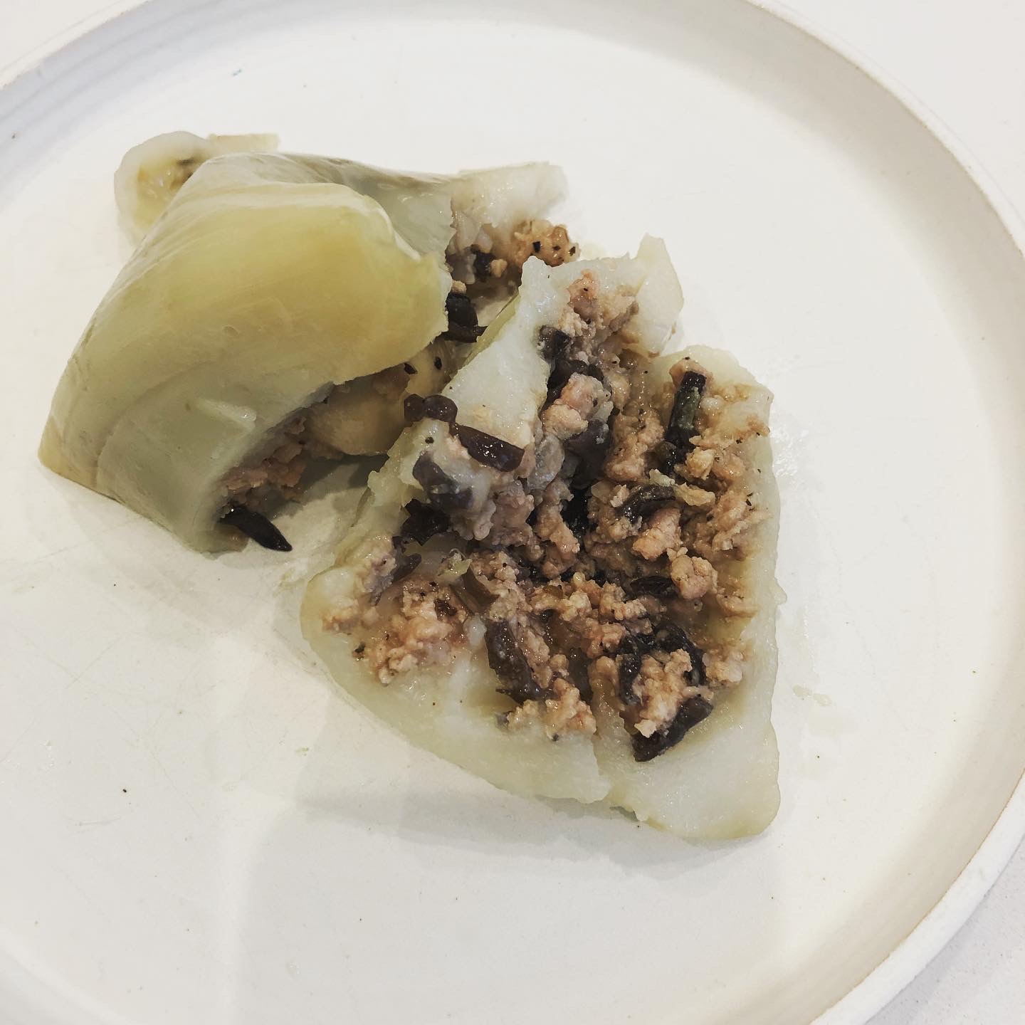 Online sources say that Banh Gio originated in Northern Vietnam and got their name because they were made by Vietnamese charcutier who make the mortadella like pork sausage called gio. Banh is a generic Vietnamese term for foods made with flours, legumes and starches, so Banh Gio.