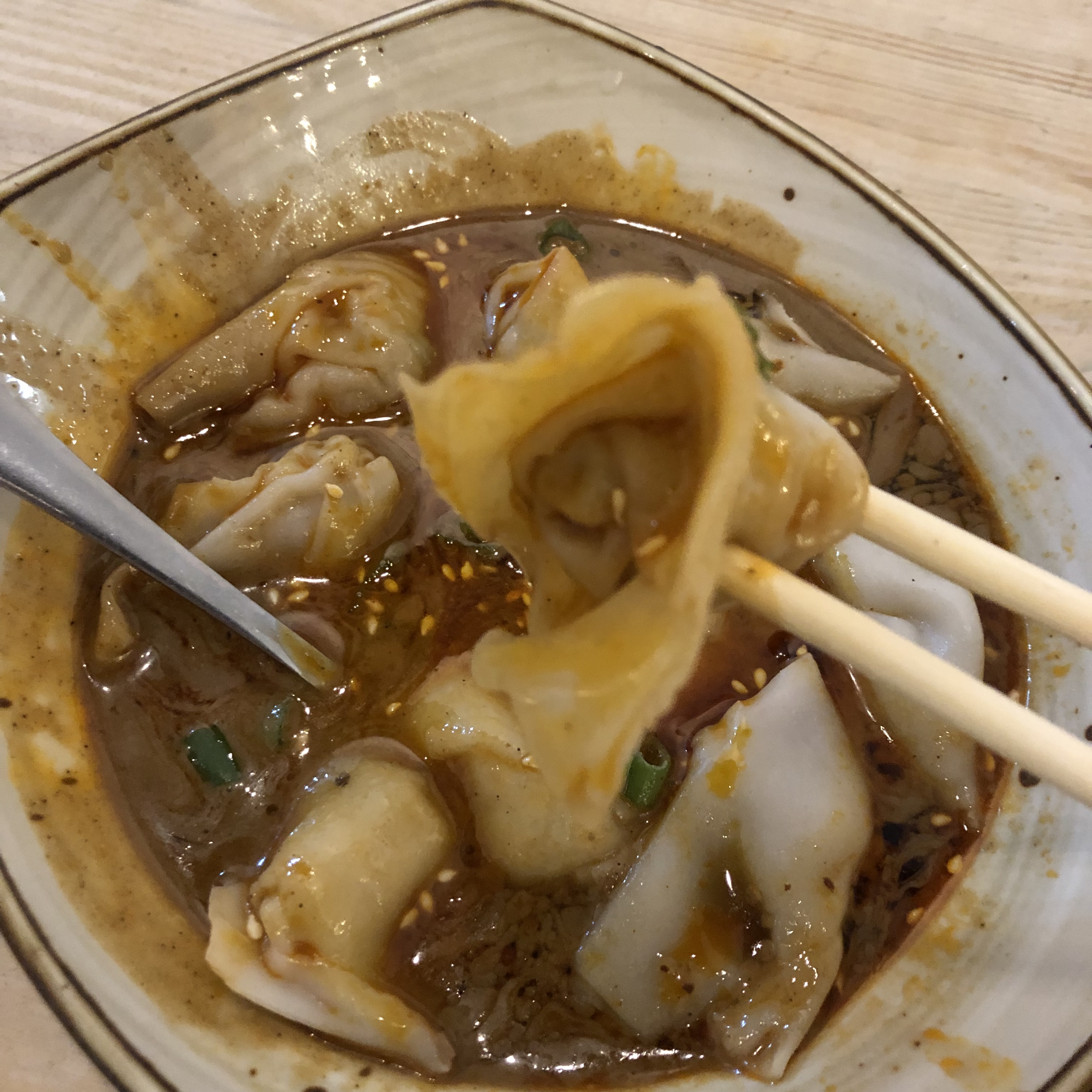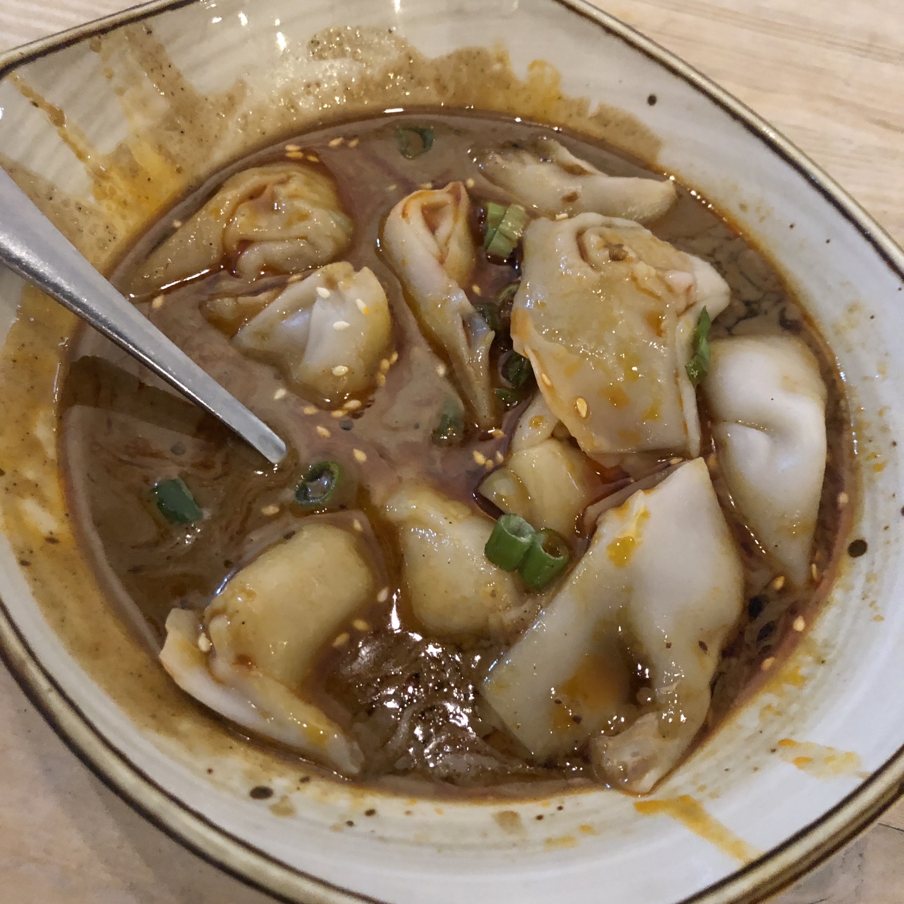 The Dumplings: The dumplings were quite disappointing. The first time there, I had the steamed veggie dumplings they were really good but the second time around they were way over cooked, to the point where the green dough was washed out and had turned pale. The Pork Wontons in Chili Oil were another fail. The wontons themselves were under stuffed with measly amounts of filling and were served lukewarm. Probably because they were under cooked, the wrappers were stiff and chewy. In addition they were not even served in chili oil, but rather they were served in a mixture of soy sauce and the same sesame sauce that came with the noodles. There might have been a little chili oil mixed in, but there was no chili spice heat..