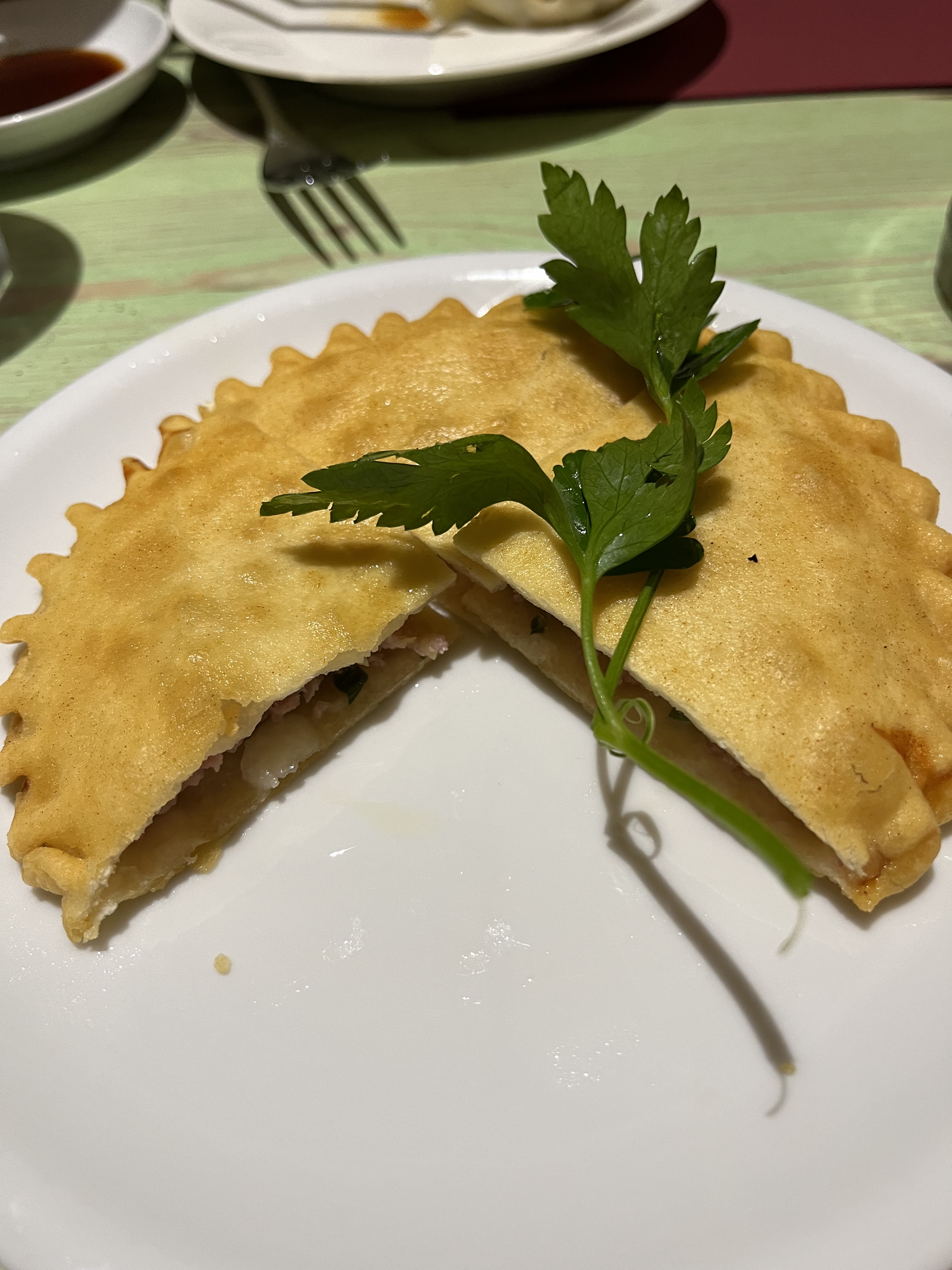 They have a slightly thicker crust than the average pan-fried dumpling and are folded to leave both ends open.