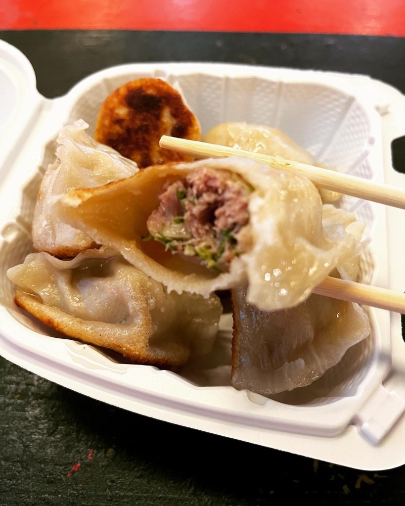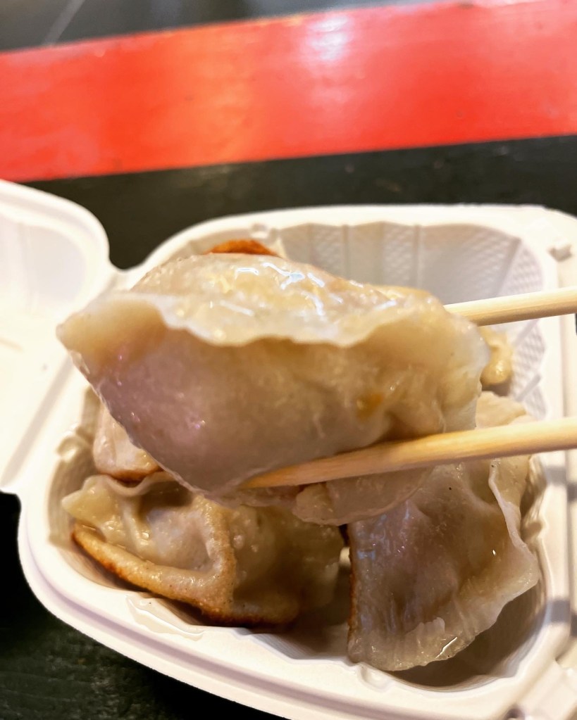 The Dumplings:  The menu includes dumplings stuffed with: pork & Chinese cabbage; pork & green pepper; pork & sauerkraut; chicken and green peppers; beef & celery; beef & onion; shrimp, egg and chives; shrimp, pork and chives; and veggies – Chinese cabbage, mushroom, and carrot.  All of the dumplings can be ordered steamed or pan-fried.  The dumplings are served in clam-shell to-go containers with a small tub of dipping sauce.