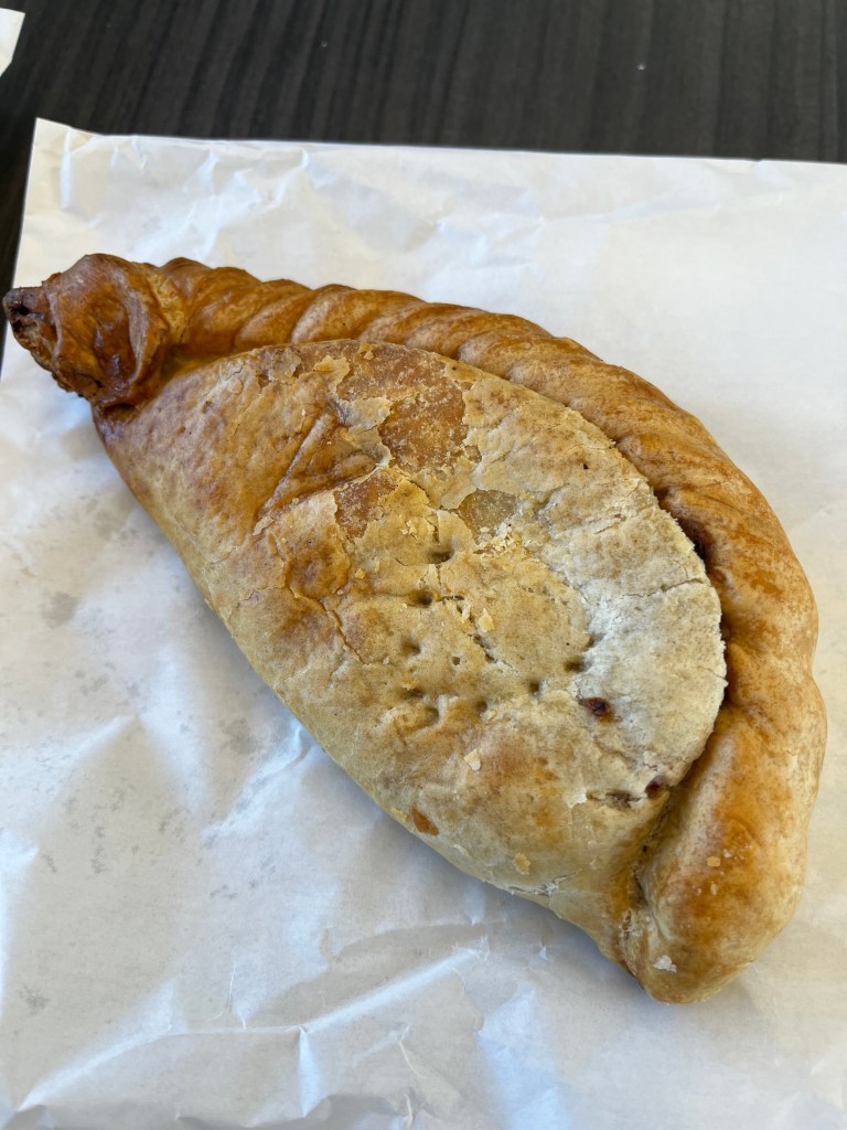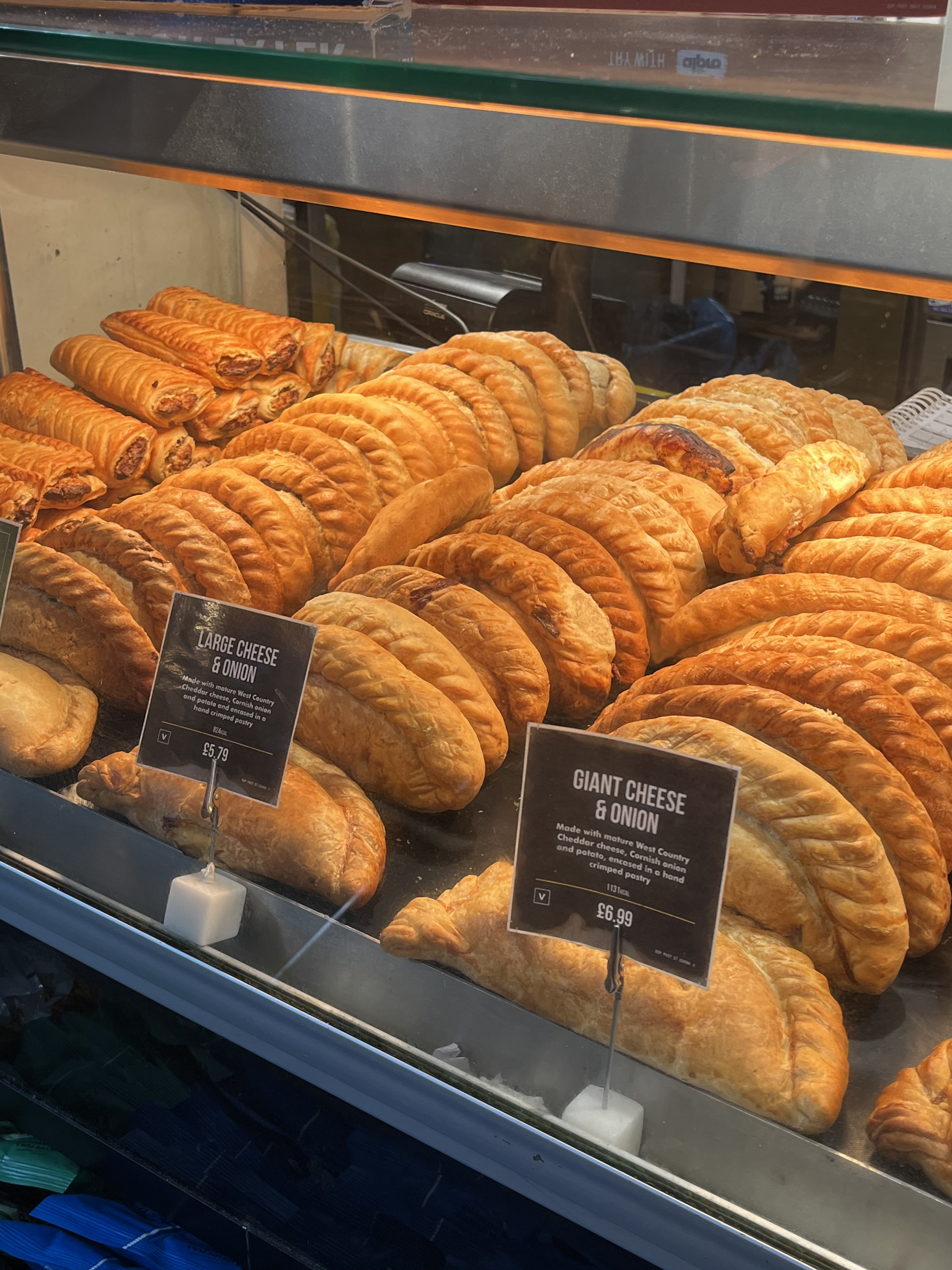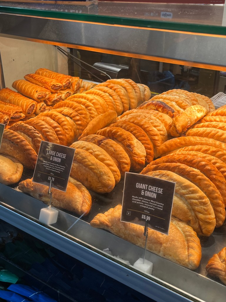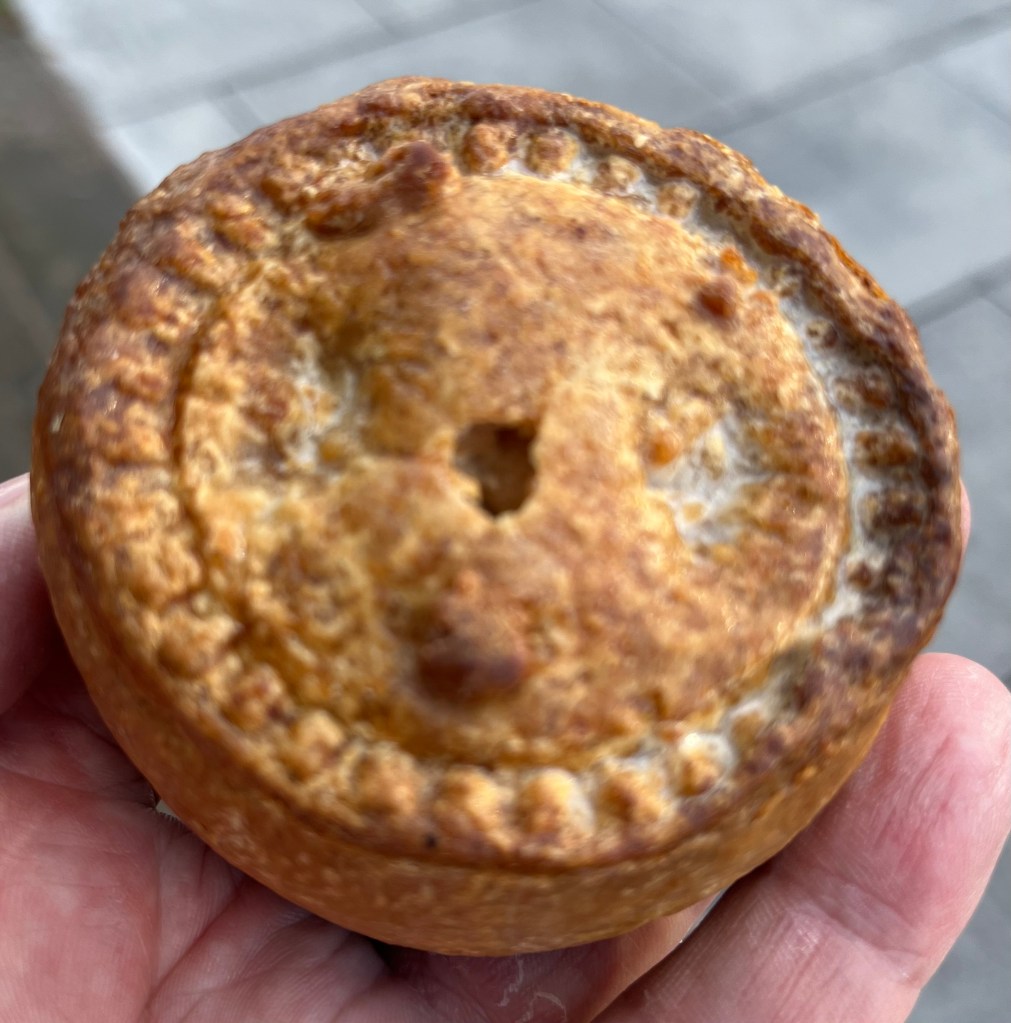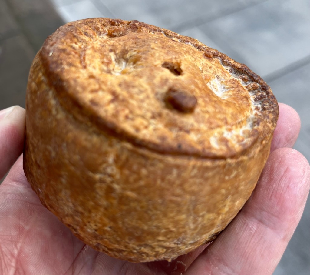 The Pasty Shop, at King’s Cross Station. Forget going to the tourist trap of platform 9 and 3/4, waiting on line for a photo with the luggage trolley embedded in the wall and the Harry Potter Shop, instead turn around 180 degrees and go to the Pasty Shop. They have the traditional Cornish Pasty and some not so traditional varieties, and a vegan pasty and a vegan sausage roll. As you can see the warm orange lights they use in the display cabinet make the pastys look more golden than they really are, but they are quite tasty.