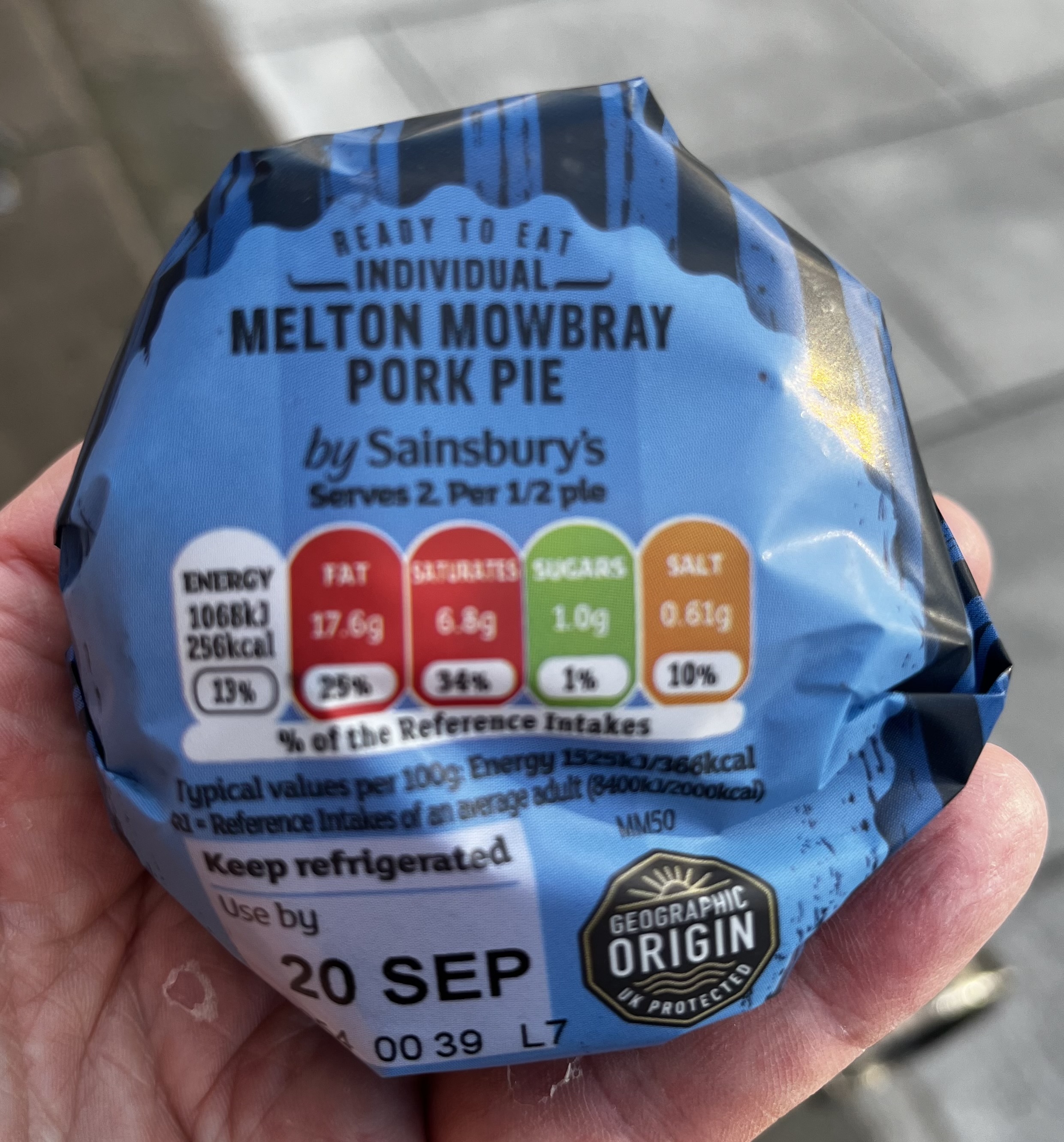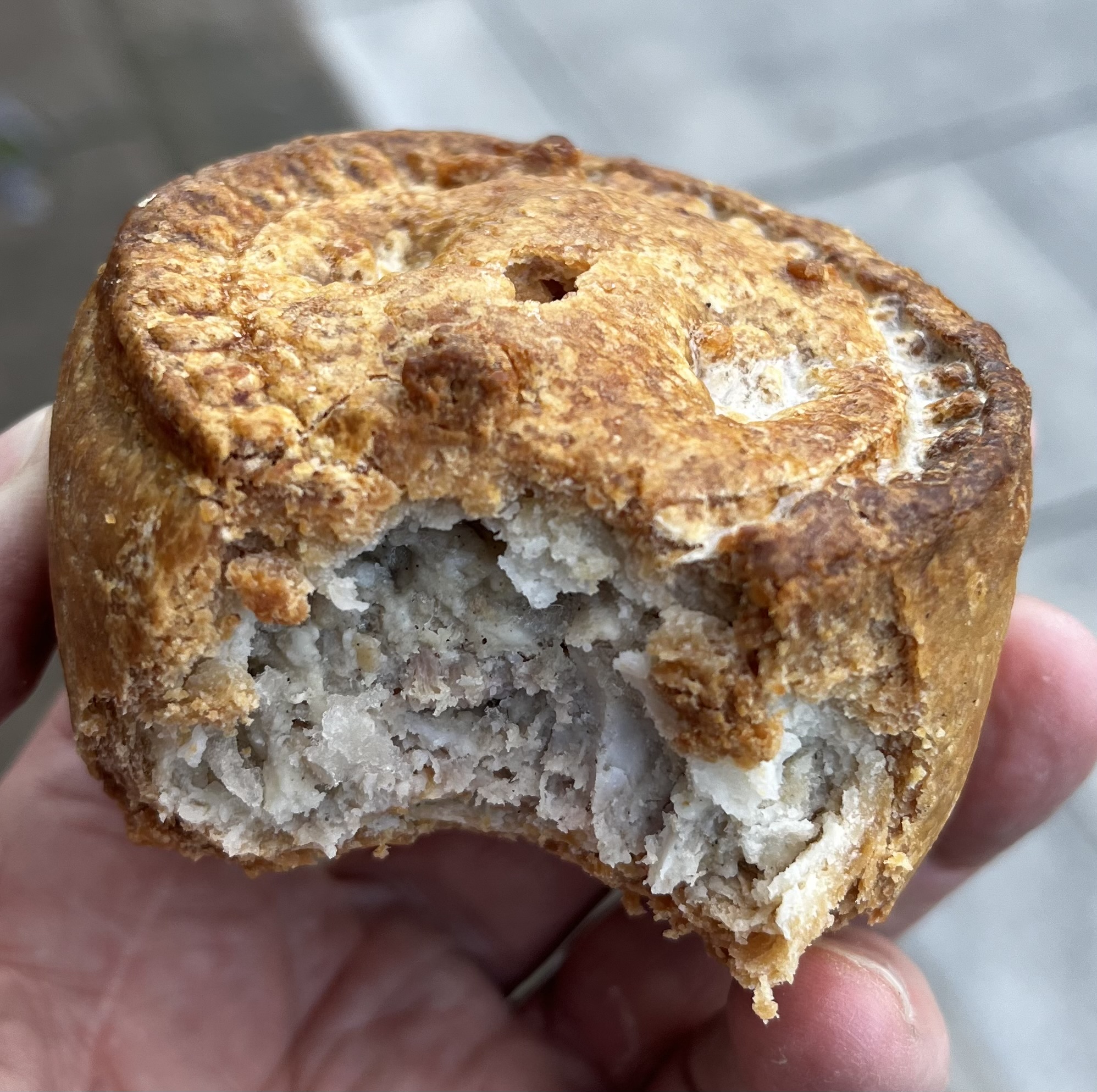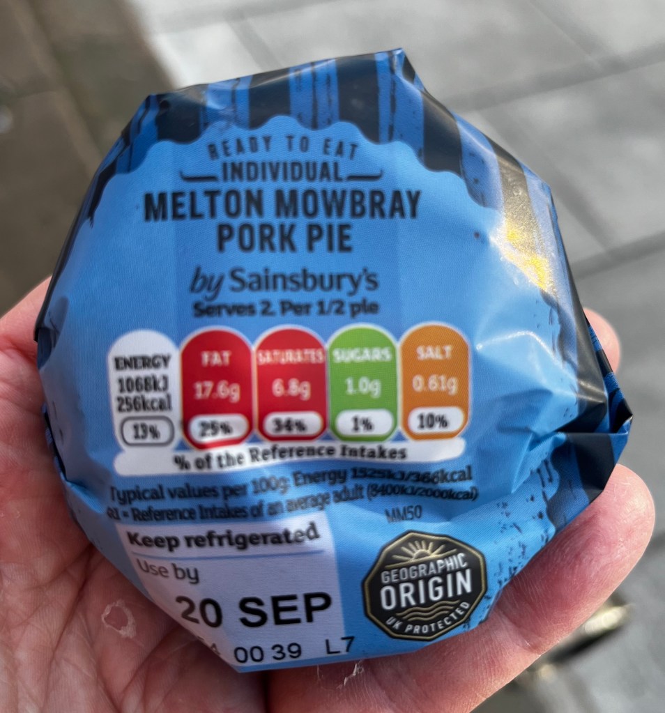 Sainsbury’s Melton Mowbray Pork Pie. This classic English mini-pork pie was a delicious calorie bomb. A single mini-pie is meant to serve two!!, at 256 kcal, and 17.6g of fat (25% of recommended daily allowance) per serving (1/2 a pie). This is a dumpling the same way a pasty is a dumpling. Available at every Sainsbury’s I have ever gone to.
