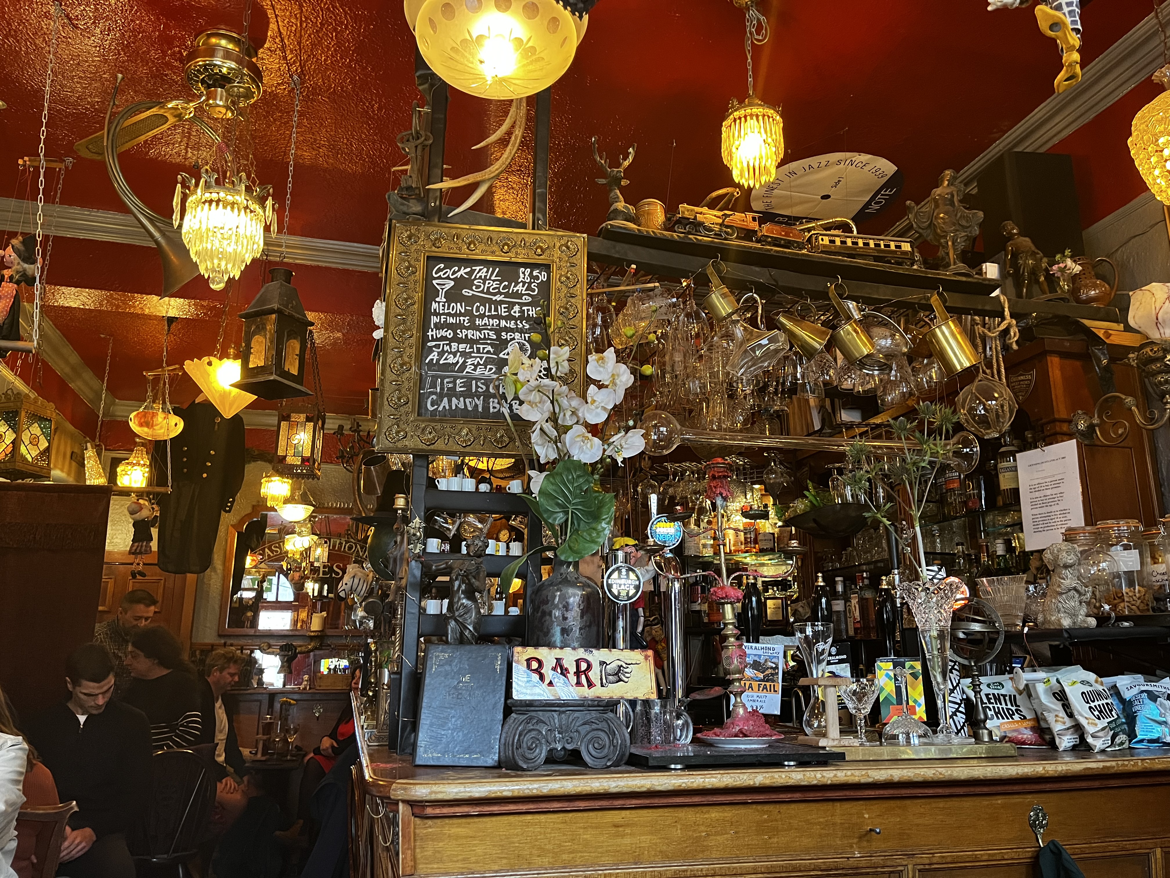 St. Bernard’s Bar, Stockbridge Edinburgh, of the many Scottish pubs I tried in Edinburgh this was the best. This is a small pub decorated in an endless array of antiques, or quasi-antiques, with a proprietor sporting old timey mutton chops and suspenders. The ground floor is so small that when he seats, you the proprietor will let you know that you may be sharing a table with another party. When I visited he was giving everyone free tastes of a Belgium Ale called Pauwel Kwak, and like any good dealer, only the first taste is free. The Kwak was excellent and is served in a special 10 ounce, bulb shaped glass. St. Bernard’s is dog friendly.