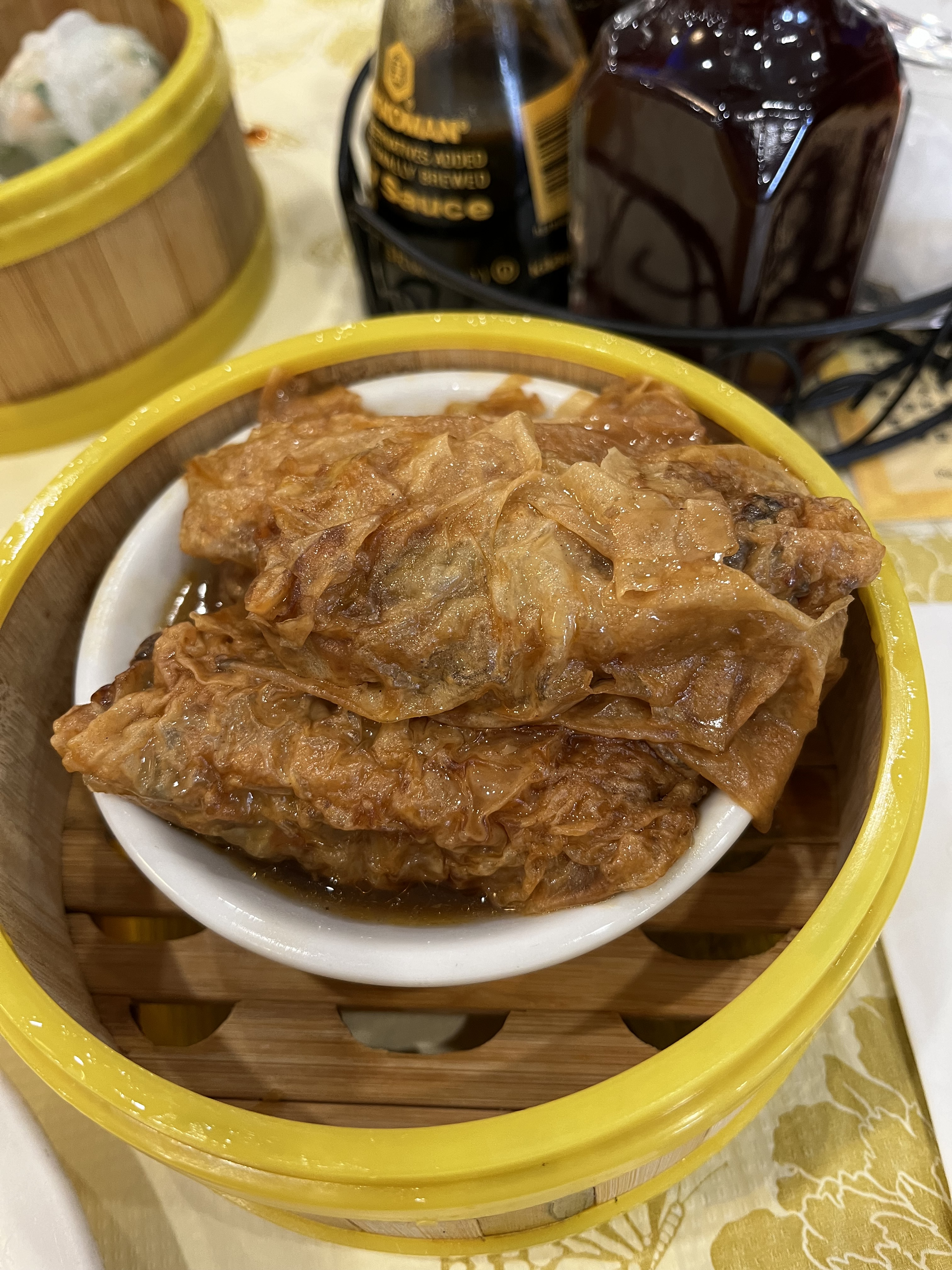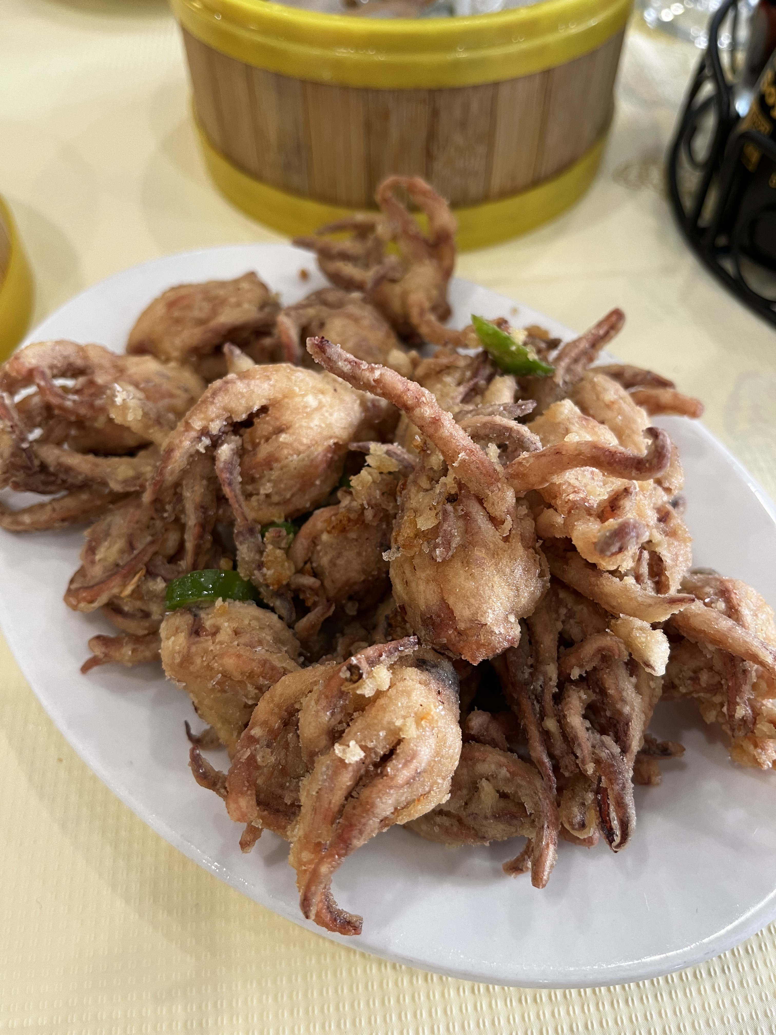 The dish with tofu skins wrapped around pork, and some sort of crunchy vegetable, was really good. The tofu skin had been braised or marinated in a sweet soy sauce, which balanced the slightly fatty and savory pork. But the standout dish was the salt and pepper baked tiny squid, which were super salty, spicy, crispy and crunchy, and so good.