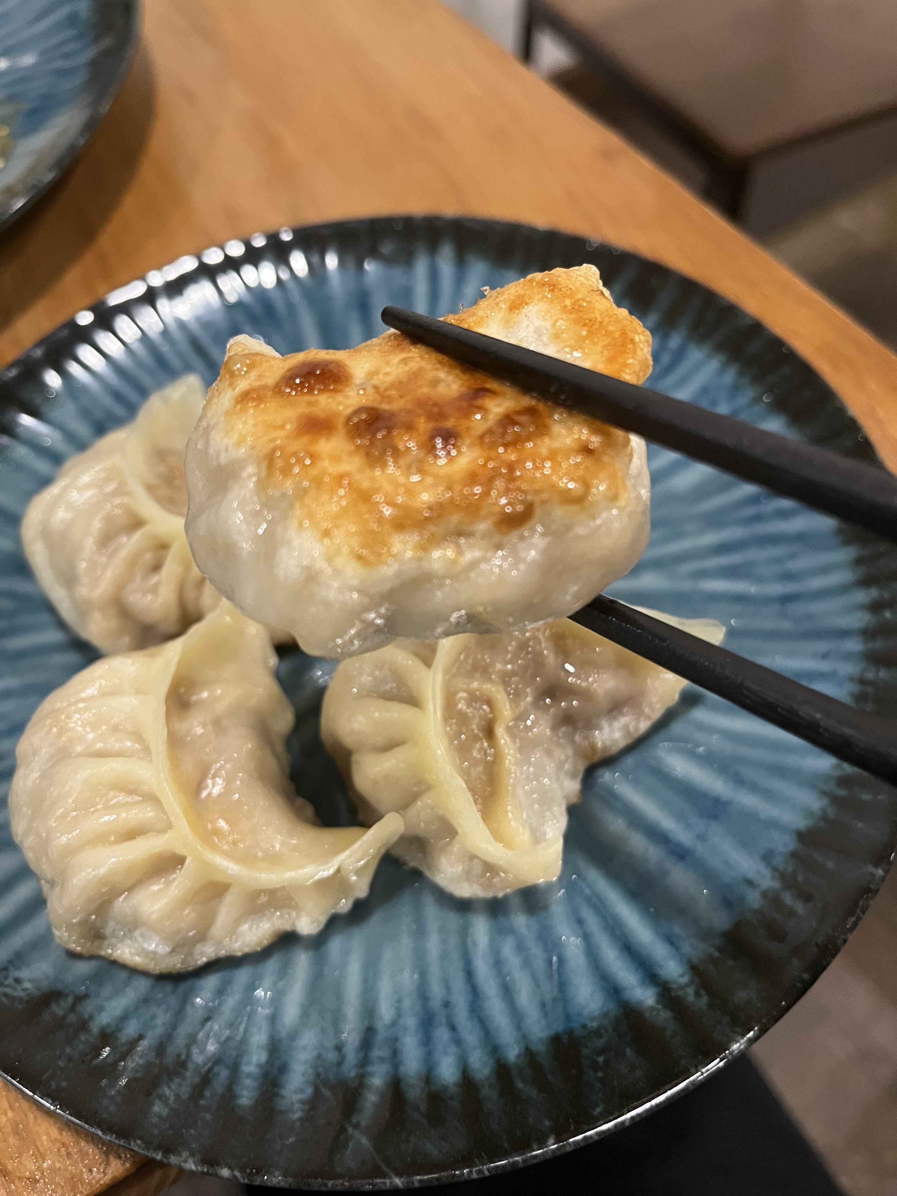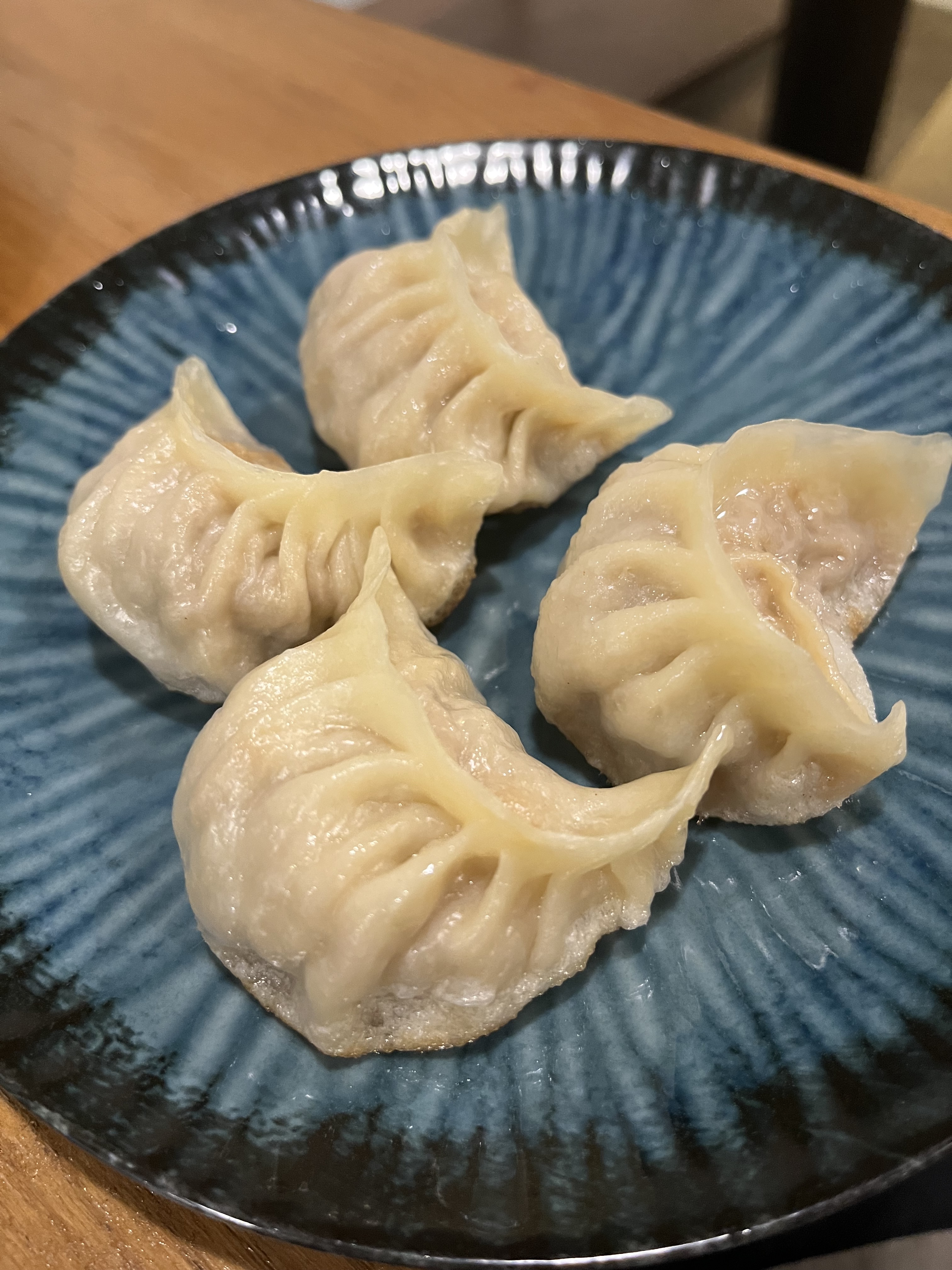 The Dumplings: I tried the pan-fried pork dumplings and pan-fried shrimp dumplings and the steamed veggie dumplings. Both types of pan-fired dumplings had relatively thick wrappers and were seared crispy golden to brown on the bottom. The pork dumplings were delicious, savory, salty, porky and very juicy. I ended up getting them twice during our trip. Without a dunking in the dipping sauce, the shrimp dumplings were less flavorful and needed some seasoning, but the shrimp tasted really fresh. You can watch the veggie dumpling being stuffed at a workstation and steamer set-up next to the cash register. The filling looked to be solely comprised of par-cooked bok-choy greens. These veggie dumplings were excellent, the filling was well seasoned and they tasted like healthiness, without tasting too intensely cruciferous. These little veggie bombs were a great antidote to the porchetta, ham and pasta I was otherwise gorging on.