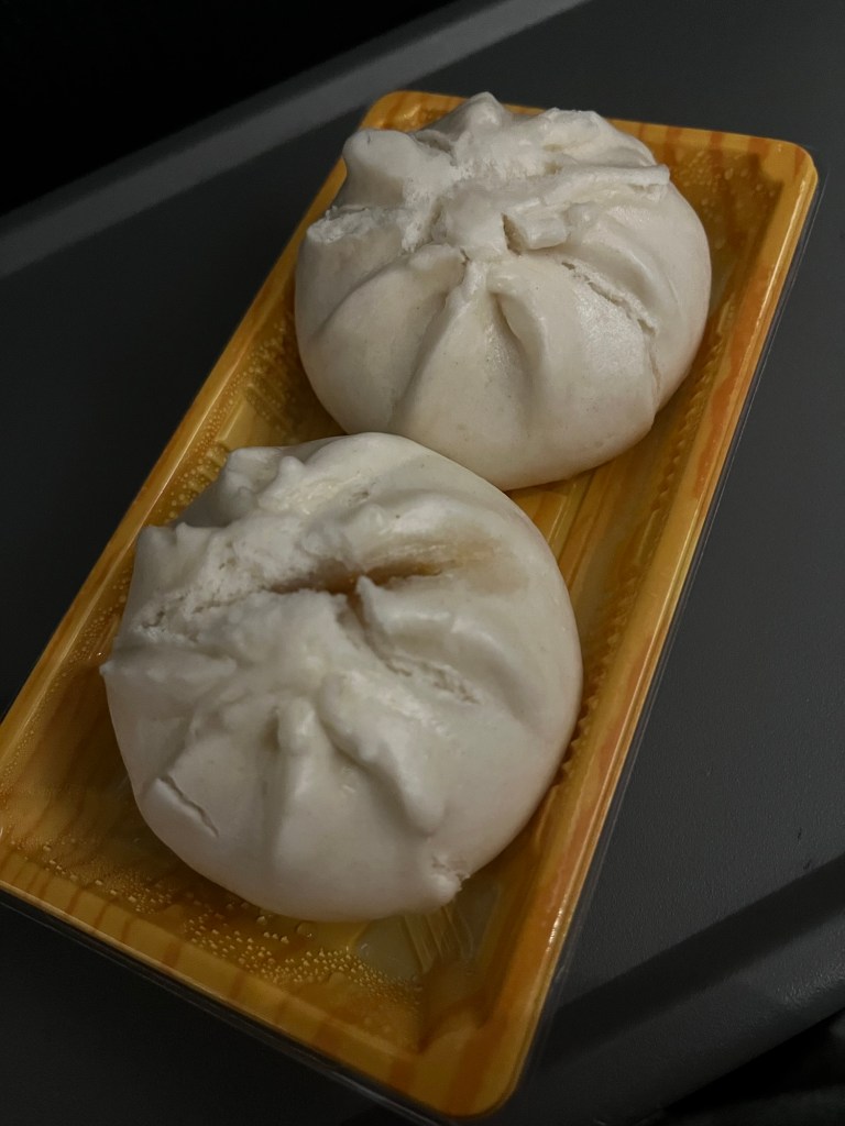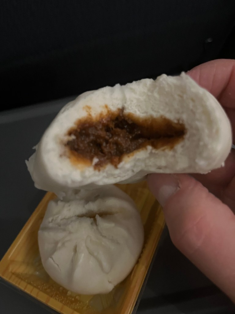 They recently started selling steamed mini barbecue pork buns, which come two per order. On both occasions when I purchased them, they were still warm so the buns were fluffy and moist. The barbecue pork inside is Chinese style and is very sweet with a hint of five spice seasoning. These are very good steamed buns and are perfect to eat on the train.