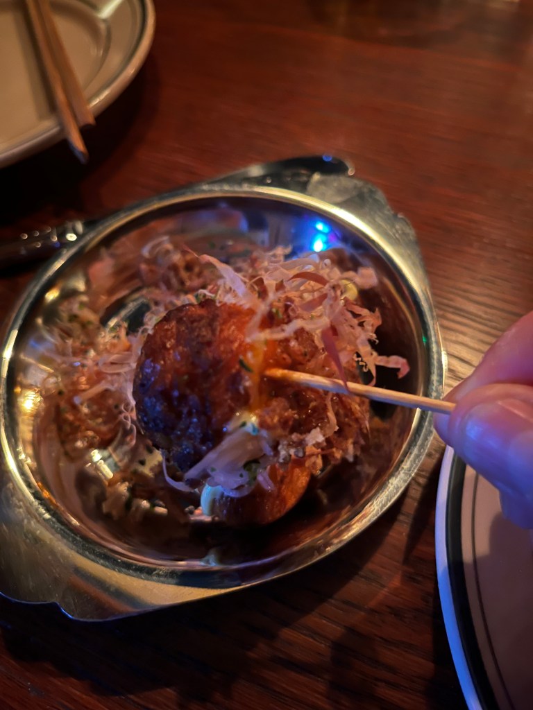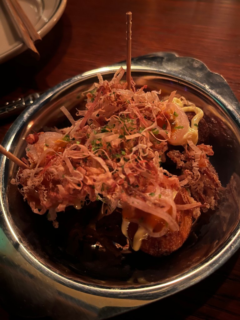 The Age Takoyaki was the best dish we ate at dancerobot. These octopus balls are prepared with a sauce of brown butter and fish sauce and are adorned with caramelized fried shallots and bonito flakes. The funk from the fish sauce and the crunch from the fried shallots were the perfect complement to the creaminess of the interior of the fried balls. Each of the Takoyaki contained a generous portion of slightly chewy octopus. This was a great dish.