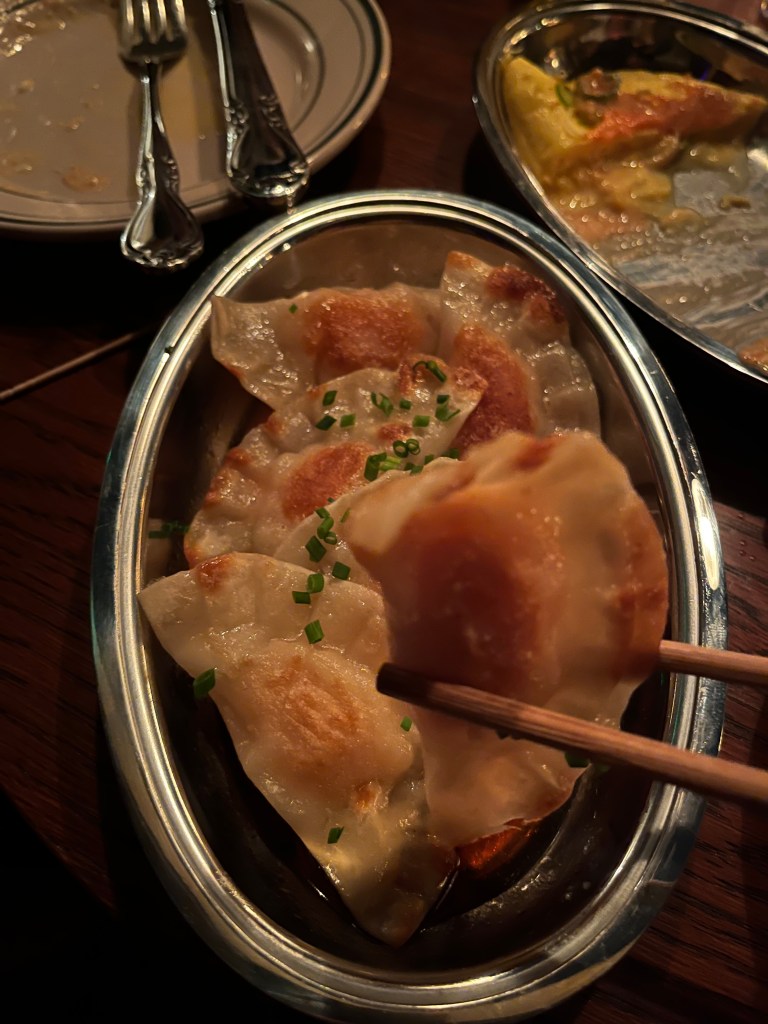 The Dumplings: The Ebi Chili Gyoza are pan-fried flat dumplings filled with chunks of sweet fresh shrimp, served in a puddle of vinegar flavored soy sauce. Separately the dumplings and the sauce probably would have tasted excellent, but when served together the dumplings got sodden in sauce, which becomes overpowering, and the gyoza wrappers lost their crunch. This dish would have been much better if the sauce were served on the side for dipping.