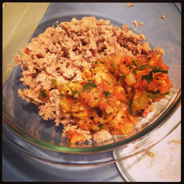 2. In a large bowl mix the chopped kimchi, 2 tablespoons of kimchi juice from kimchi jar and BBQ pork together. The final mix should have a orange-reddish hue. Note: if you use pulled pork you might need to give it a chop to make the pork easier to use as a filling.