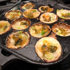 The Dumplings: The Takoyaki at Ku are expertly cooked so they are crispy and crunchy on the outside with a creamy interior and a small piece of just cooked crunchy octopus in the middle. They are served blazing hot, so let them cool a little or risk burning your mouth. The Takoyaki are served on a bed of slivered cabbage and are adorned with drizzles of brown Tako sauce and Japanese mayo, sheets of bonito flakes and chopped scallions. The best Takoyaki have layers of toppings that bring a symphony of sweet, tangy sour, umami, and salty flavors to the dumplings. But at Ku the scallion pieces were cut too big for my taste and their strong flavor over powered the other toppings. I think they should have been cut finer and used a little more sparingly. But if you pick off some of the chunks of scallion these Takoyaki were really good. Ku also serves pan-fried gyoza.
