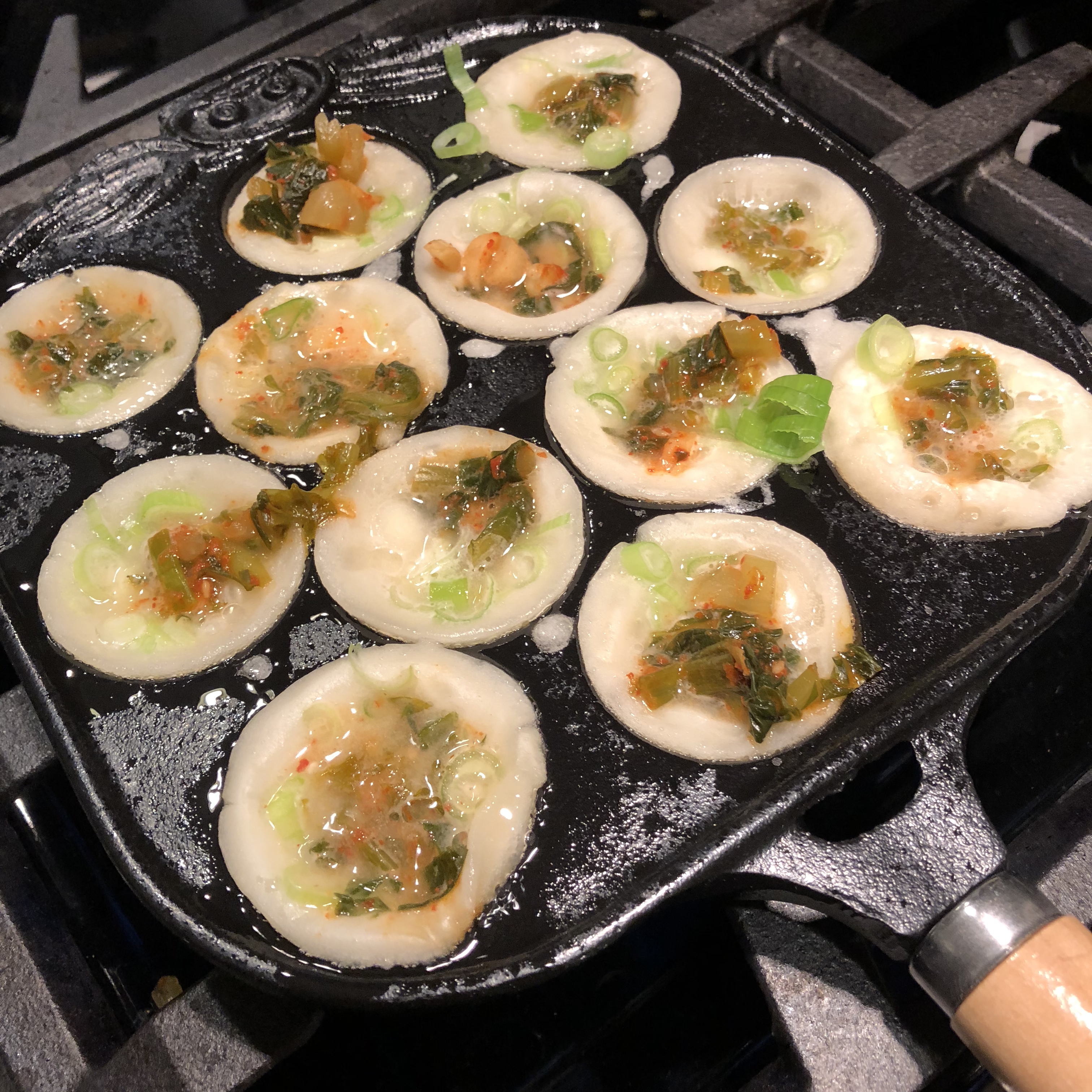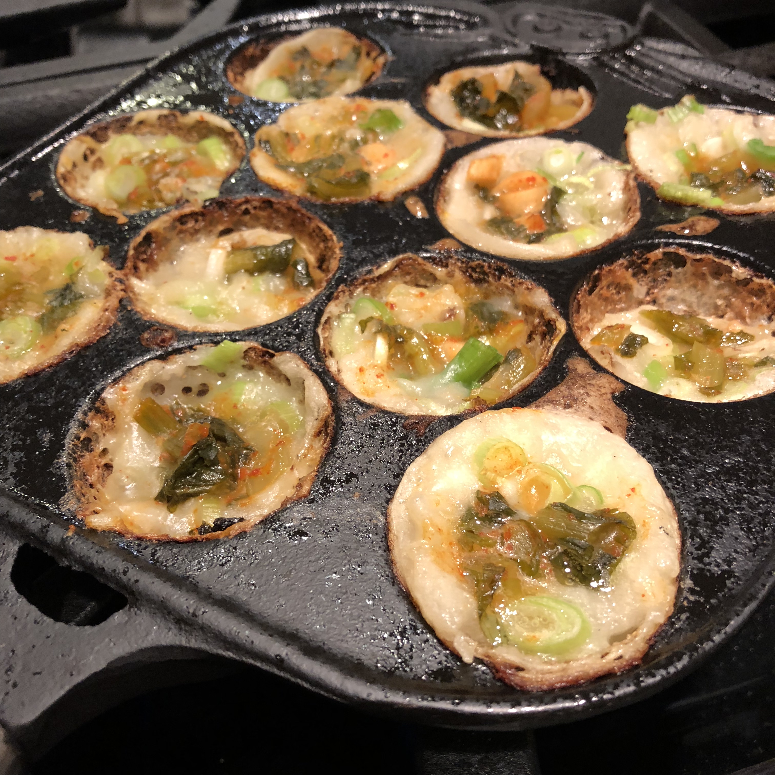 The Dumplings: The Takoyaki at Ku are expertly cooked so they are crispy and crunchy on the outside with a creamy interior and a small piece of just cooked crunchy octopus in the middle. They are served blazing hot, so let them cool a little or risk burning your mouth. The Takoyaki are served on a bed of slivered cabbage and are adorned with drizzles of brown Tako sauce and Japanese mayo, sheets of bonito flakes and chopped scallions. The best Takoyaki have layers of toppings that bring a symphony of sweet, tangy sour, umami, and salty flavors to the dumplings. But at Ku the scallion pieces were cut too big for my taste and their strong flavor over powered the other toppings. I think they should have been cut finer and used a little more sparingly. But if you pick off some of the chunks of scallion these Takoyaki were really good. Ku also serves pan-fried gyoza.